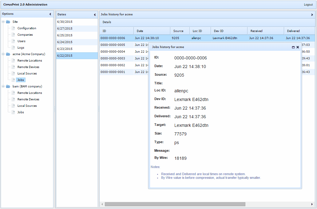 | • | Received is the date and time the job was fully received by the remote client (in client-local time)